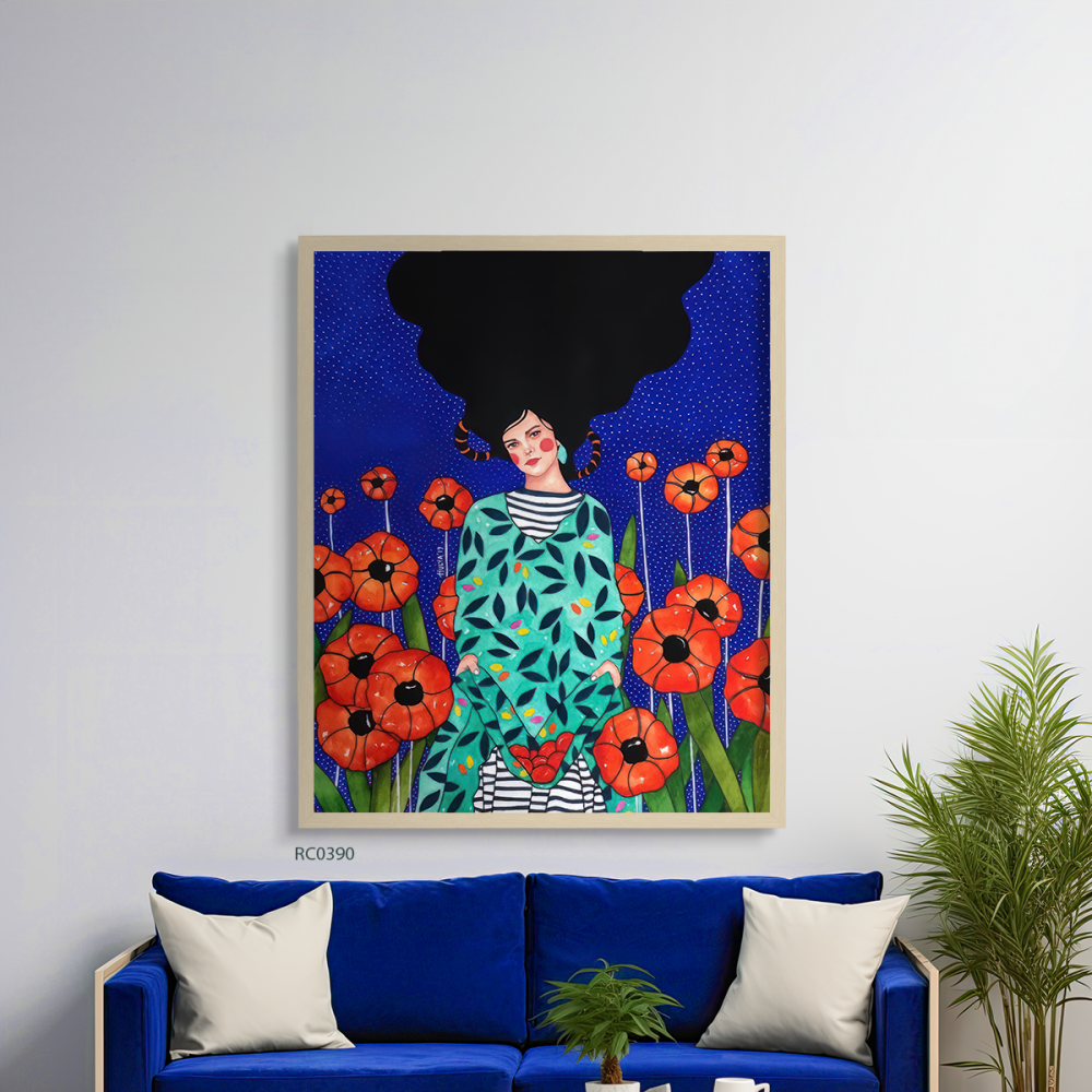 لوحة فنية جدارية كانفس فتاة مع ازهار تدرجات البرتقالي مع التيفاني والكحلي