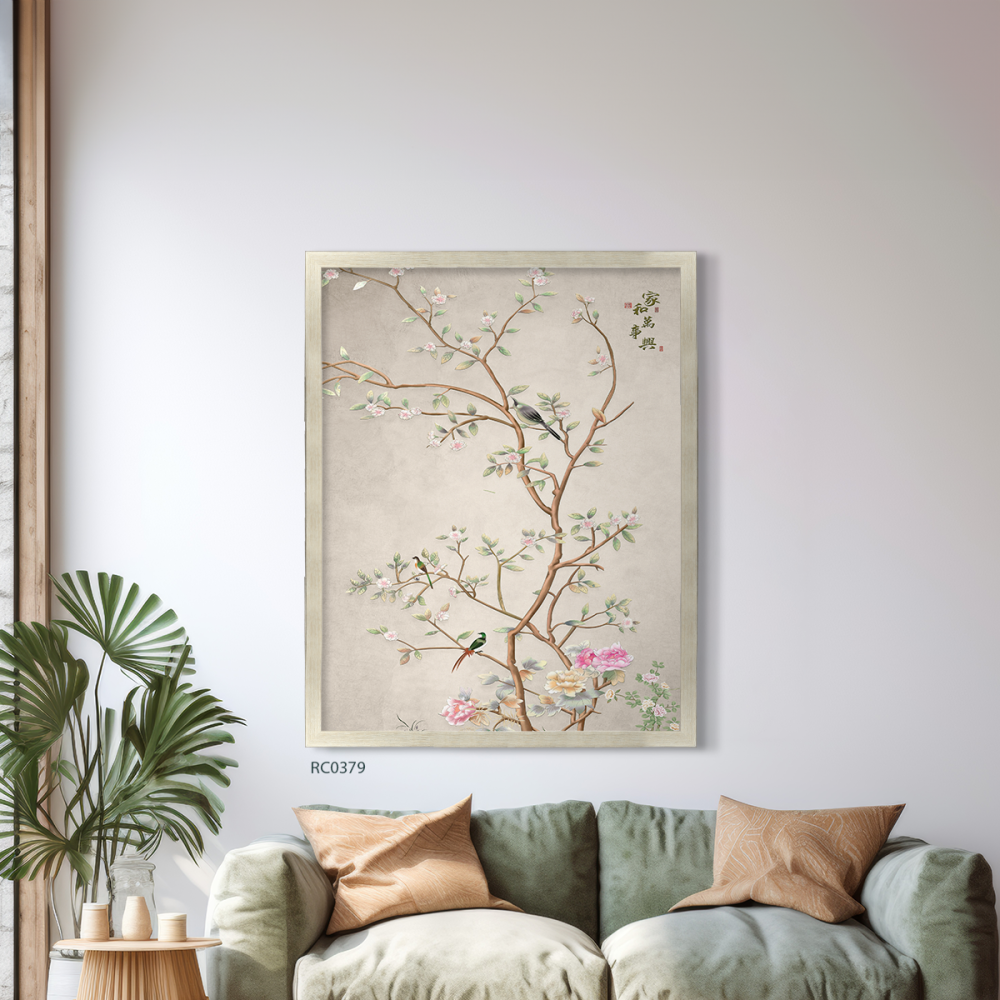 لوحة فنية جدارية كانفس ورد واغصان وطيور,رمادي ووردي