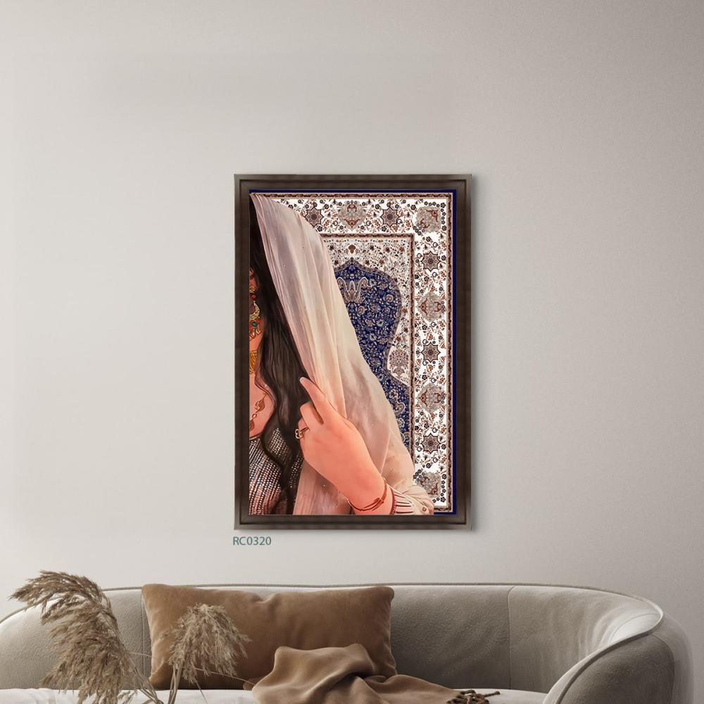 لوحة جدارية كانفس فتاة عربية بخلفية نقوش سجاد ازرق وابيض وبيج
