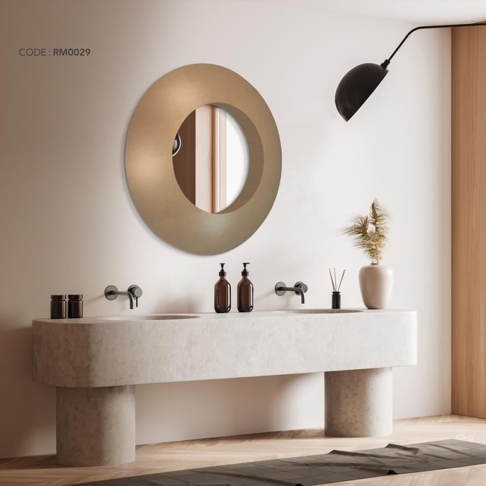 مرآة فاخرة بتصميم هندسي أنيق ، تتميز بشكلها الدائري الفريد مع حلقة خارجية واسعة يخلق التباين بين الإطار العريض والمرآة الداخلية عمقًا بصريًا جذابًا، م...